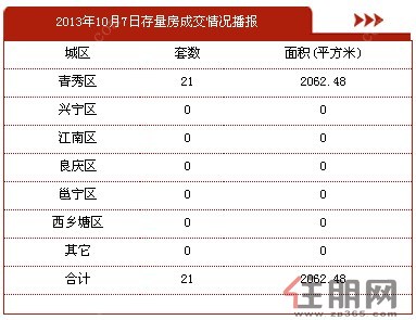 此外,10月7日南宁存量房成交21套,面积2062.48㎡。全部集中在青秀区,占21套。