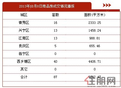 南宁市房管局网站数据显示,10月8日南宁商品房成交87套,面积9842.47㎡。从各城区成交分布来看,其中青秀区占16套,兴宁区占13套,江南区占13套,良庆区占5套,西乡塘区占40套。